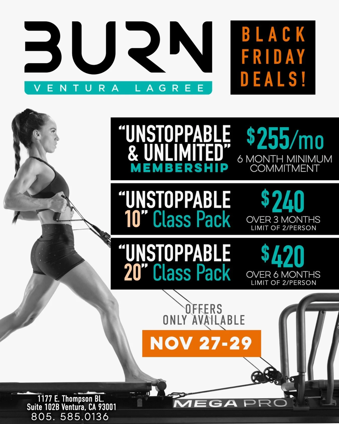 Focusing on core, strength, and endurance, BURN teaches the Lagree Method as a high-intensity, low-impact, anti-inflammatory exercise method that tightens, strengthens, and tones while also working on posture, stability and flexibility.
